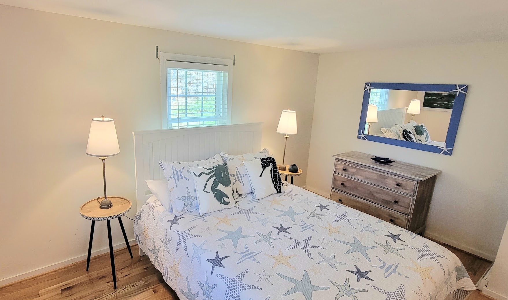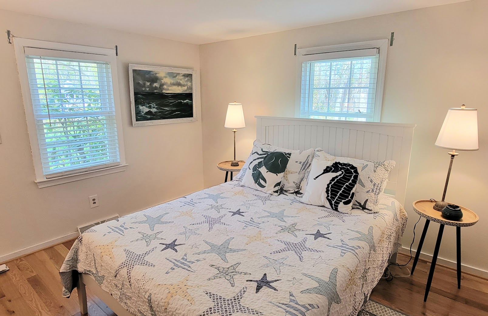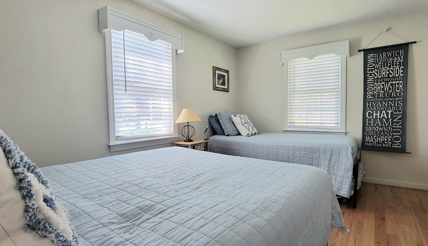 There are 2 bedrooms (one with a queen and the other with a queen/twin trundle so 2 twins - living room, porch, full bath, additional outside shower, huge patio, private yard in a quiet neighborhood all within close proximity to beaches, restaurants, ice cream, mini-golf and shopping - all you need for that quintessential Cape Cod vacation!